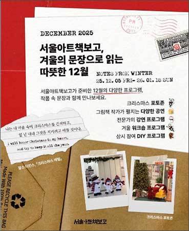 [우리문화신문=이윤옥 기자] 서울시가 (사)대한출판문화협회에 위탁하여 운영하는 서울책보고(송파구 잠실나루역)와 서울아트책보고(구로구 고척스카이돔 지하)가 다가오는 연말과 겨울방학을 맞아 겨울 특별 프로그램을 선보인다. 한 해를 차분히 정리하는 ‘기록’의 가치와 세계명작의 명문장으로 채워진 크리스마스 축제 분위기를 통해 시민들에게 따뜻한 위로를 선사할 예정이다.