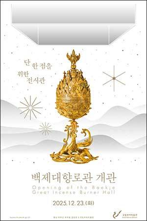 [우리문화신문=한성훈 기자] 국립부여박물관(관장 신영호)은 백제문화와 금속공예의 정수를 보여주는 국보 백제금동대향로 전용 전시관 「백제대향로관」을 2025년 12월 23일 개관한다. 1993년 12월 12일, 부여 능산리 절터에서 발굴된 백제금동대향로는 용과 봉황, 신선과 동물, 악기를 연주하는 다섯 연주자 등으로 이루어진 독창적인 조형으로 백제인의 세계관과 사상을 집약적으로 보여주는 국보이다. 국립부여박물관은 향로의 예술적ㆍ사상적 의미를 조명하기 위해 5년 동안의 준비 끝에 전용 전시 공간을 마련했다.