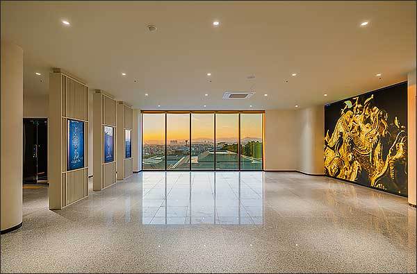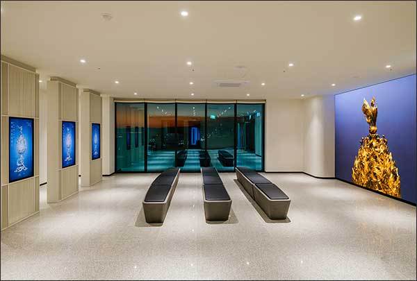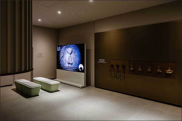 국보 백제금동대향로를 전시한 감상 공간은 약 77평 규모다. 초타원형의 공간 개념을 바탕으로 벽체와 모서리를 곡선으로 구성하고, 천장에는 직선으로 이루어진 사각 구조물을 배치했다. 곡선과 직선이 함께 어우러진 이 공간 구성은 조화와 융합을 드러낸다. 벽체를 따라 마련된 일체형 의자는 관람객이 자리에 앉아 향로와 전시 공간을 함께 감상할 수 있도록 했다.