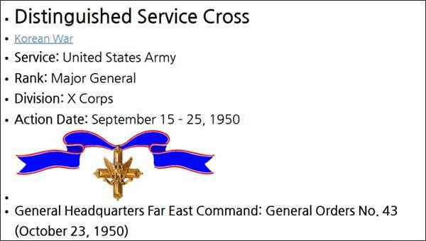 "인천을 점령하는 동안, 아몬드 장군은 직접 최전선 부대를 방문하고 전술적 노력을 조율했으며, 자신의 용감한 모범을 통해 부대들이 부여된 목표를 점령하는 것을 도왔습니다. 인천 함락 뒤, 알몬드 장군은 직접 병력을 지휘하여 적 점령 지역을 가로질러 신속하게 진격하여 서울을 점령하고 적군 전력의 와해를 가속화했습니다.