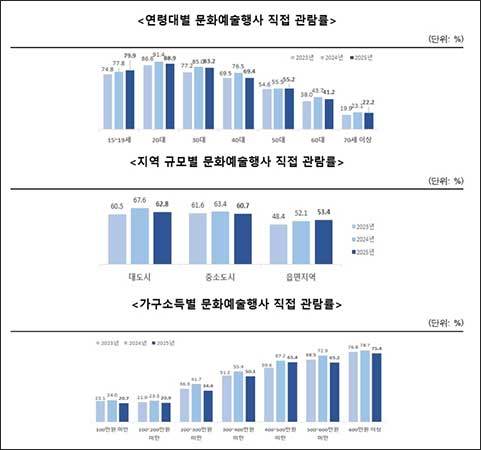 * 문화예술행사 직접 관람률(%): (’23년) 58.6 → (’24년) 63 → (’25년) 60.2