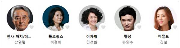 출연진은 천사-까치ㆍ에른스트 역에 남명렬, 플로랑스 역에 이정미, 이자벨 역에 김선화, 뱅상 역에 한인수, 마틸드 역에 김설이 무대에 오른다.