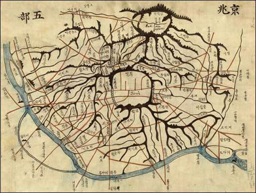 이 한글 지도는 김정호의 대동여지도에 수록된 경조오부도( 京兆五部圖)의 지명을 한글로 바꾼 것이다. 경조오부도는 도성 밖을 중심으로 그린 지도다. 경조(京兆)는 도읍을 뜻하고 한성부(漢城府)의 행정구역이 5부(部)로 나누어져 있었기에 ‘경조오부’라고 한 것이다.