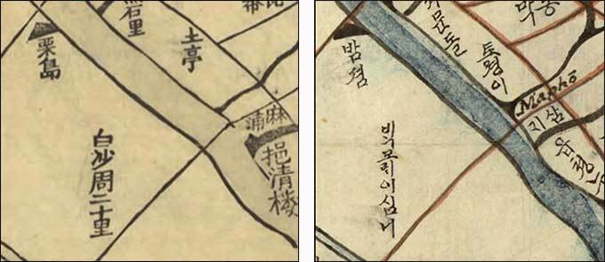 그런데 조지 포크의 한글 서울 지도에서 가장 흥미로운 대목은 대동여지도상의 한자 지명을 기계적으로 옮기지 않았다는 점이다. 그 땅에 살고 있는 조선인들이 부르는 토박이 조선어 이름을 한글로 옮긴 것이다. 아래는 그 사례들이다. 왼쪽에는 대동여지도상의 지도를, 오른쪽에는 포크의 한글 지도를 나란히 놓아 쉽게 대조해 볼 수 있도록 했다.