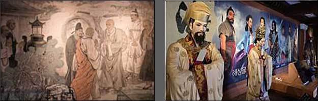 장보고 기념관으로 이동하여 동상과 초상화로 장보고를 만났다. 근엄한 기상으로 위엄이 있다. 유물마다 한글 설명을 붙여두어 이해하기 좋았다. 건물 가운데는 드라마 ‘해신’의 영상과 출연진 사진을 전시해 두었다. 법화원 본당 대웅보전에는 한국의 부처님과 모습이 비슷하여 중국 절과 분위기가 다르다. 부처님 양옆에 제자 마하가섭과 아난다, 동서남북 벽에 문수보살, 보현보살, 십팔나한 벽화가 있다. 지장보살이 인상적이었다.