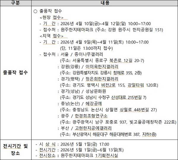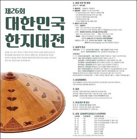 제26회 대한민국한지대전 공모요강과 출품원서는 원주한지테마파크 누리집(http://www.hanjipark.com)공지사항에서 확인할 수 있으며, 원주한지테마파크 접수처를 통해 공모 참여할 수 있다.