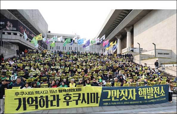 2026년 3월 11일은 후쿠시마 원전 사고가 난지 15돌이 되는 날이다. 이날 낮 1시 서울 세종문화회관 앞 계단에서 전 제주교구장 강우일 주교 집례로 ‘핵 없는 사회를 위한 시국미사’가 봉헌되었다. 미사를 봉헌한 뒤 ‘신규핵발전소저지 전국비상행동’ 출범식과 탈핵 선언대회가 열렸다.