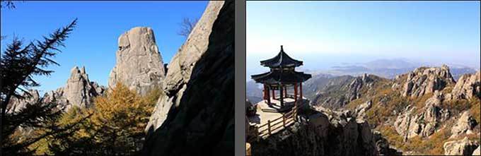 ▶낭야대(琅琊台, 높이 183.4m) : 두 시간을 달려 낭야대 주차장에 도착했다. 전동차를 타고 해안 절벽을 굽이굽이 오르는 길, 바닥에 뒹구는 낙엽들이 계절의 정취를 더한다. 낭야대는 우뚝 솟은 모양이 마치 높은 대(臺)와 같다 하여 붙여진 이름이다. 삼면이 바다와 접해 있어 절경을 자랑하지만, 오늘은 해무가 끼어 해안의 아름다움을 보기 어렵고 멀리 바다만 보인다.