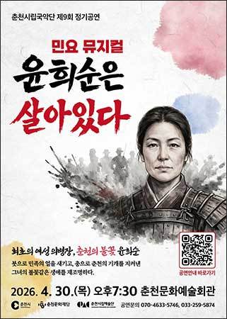 [우리문화신문=이윤옥 기자] 춘천시립국악단(예술감독 이유라)은 오는 4월 30일(목) 저녁 7시 30분, 춘천문화예술회관에서 제9회 정기공연 민요뮤지컬 <윤희순은 살아있다>를 무대에 올린다. 이번 공연은 춘천의 의병장이자 대한민국 첫 여성 의병장으로 기록된 ‘윤희순’의 불꽃 같은 생애를 민요와 뮤지컬 형식을 결합해 풀어낸 창작 국악 공연이다.
