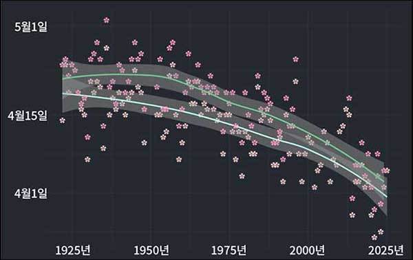 아래 그림은 서울의 벚꽃 개화일을 100년 동안 관측한 결과를 그래프로 나타낸 것이다.