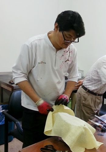 앞시간에는 형태를 만든 아이소핑크에 이형제를 발랐다. 이번 시간에는 그 위에 천을 붙이게 되는 데,