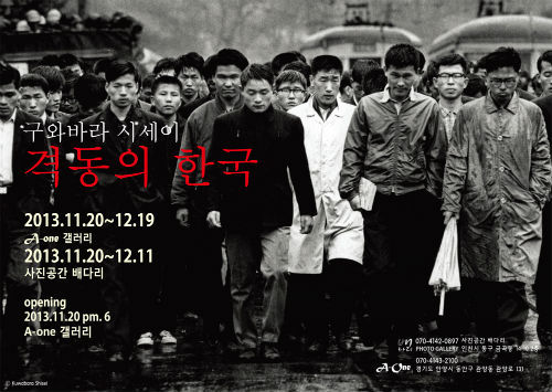 [그린경제/얼레빗 = 이나미 기자] 일본을 대표하는 다큐멘터리 사진가 구와바라 시세이 특별 초청 사진전 ‘격동의 한국’이 11월 20일부터 12월 19일까지 ‘사진공간 배다리’(관장 이상봉)와 ‘A-One’(관장 마틴리)갤러리에서 동시에 전시된다.