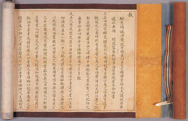 교서는 가로 289.5㎝, 세로 42.9㎝로 닥나무로 만든 바탕에 비단을 배접하여 만들었다. 먼저 감색 천으로 위와 아래에 2㎝폭으로 덧붙이고 다시 붉은색 선으로 사각의 테두리를 두룬 다음 세로로 63개의 선을 그어 그 안쪽에 검은색으로 내용을 적었다. 내용에는 반란을 진정시킨 공로를 인정하여 1등공신 1명, 2등공신 7명, 3등공신 7명을 공훈한다는 글과 15명의 이름이 들어있다. 교서의 좌우에는 나무로 축을 부착하여 말아두게 하였고 뒷면에는 신치근이 만들고 조명교가 글을 썼다는 명문이 있다.