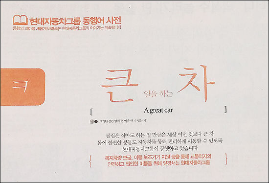 현대자동차는 "동행의 의미를 새롭게 바라보는 동행어 사전" 신문 전면광고를 계속하고 있습니다. 이번 광고는 "큰일을 하는 차, 큰차"입니다. "몸집은 작아도 하는 일만큼은 세상 어떤 것보다 큰차. 몸이 불편한 분들도 자동차를 통해 편리하게 이동할 수 있도록 현대자동차그룹이 동행하고 있습니다."라고 합니다. 얼마든지 우리말로 좋은 광고를 할 수 있음을 보여줍니다.