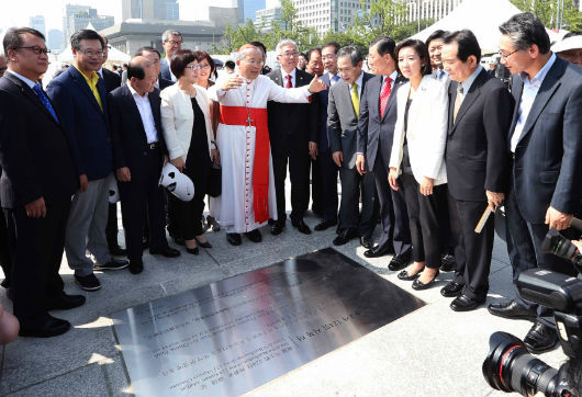 23일 광화문 광장에서 프란치스코 교황 방한 1주년을 맞아 '윤지충 바오로와 123위 시복 1주년 기념 바닥돌 축복식이 열렸다. 이날 염수정 안드레아 추기경, 김종덕 문화체육관광부 장관 등 주요 내빈들이 설치된 바닥돌을 둘러보고 있다. 기념 바닥돌은 1.7m, 세로 1m 크기로 '교황 프란치스코께서 2014년 8월 16일 이곳에서 윤지충 바오로와 동료 순교자들을 복자 반열에 올려 이를 온 세상에 선포하신 것을 기리고자 이 돌을 놓습니다'라는 문구가 새겨져 있다.
