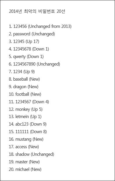 설마 아직도 이런 비밀번호를 사용하는 사람이 있을까 싶지만 놀랍게도 매우 많은 모양이다. 2014년 가장 많이 유출된 비밀번호 1위는 ‘123456’이었다. ‘Password’(2위), ‘12345’(3위), ‘12345678’(4위)이 차례로 뒤를 이었다. 이후의 순위도 비슷한 패턴의 비밀번호였다.