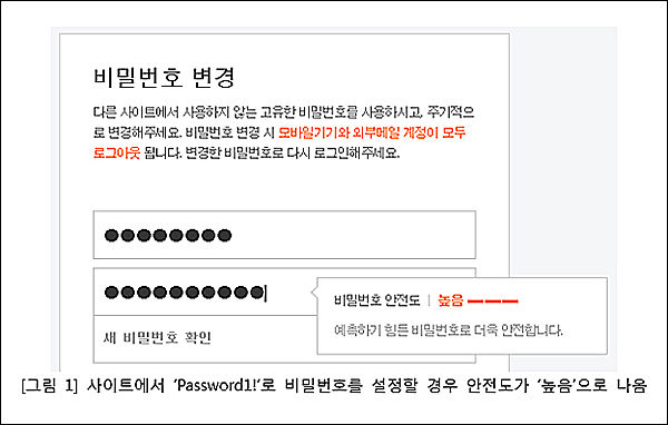 ▲ [그림1] 누리집에서 ‘Password1!’로 비밀번호를 설정할 경우 안전도가 "높음"으로 나옴