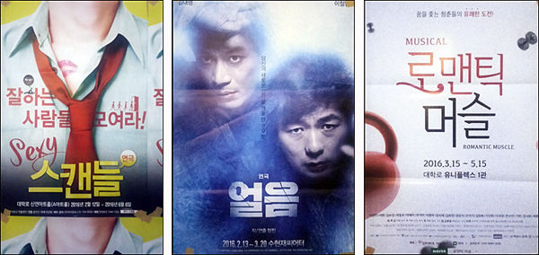버스정류장에 갔더니 공연 포스터가 3장이나 붙었습니다. 그런데 3장 모두 영어는 별로 없습니다. 보통 공연 포스터를 보면 영어를 도배한 것을 우리는 흔히 보는데 말입니다. 물론 영어를 한글로 쓴 것이긴 하지만 쓸데없는 영어를 볼 수 없다는 것이 그나마 위안이었습니다. 우리말이 아닌 한글로만 쓴 것을 칭찬해야 하는 맘도 썩 편하지 않습니다. 앞으론 길거리에 우리말로 된 포스터들만 볼 수 있으면 좋겠습니다.