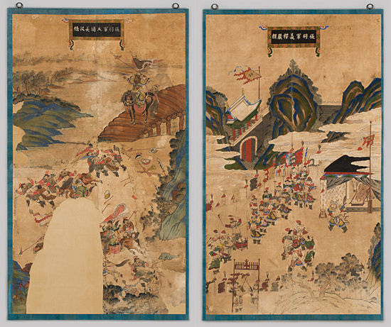 | ▲ 《삼국지도연의도》장비가 장판교에서 조조군을 크게 꾸짖다, 230×133cm, 19세기 후기, 국립민속박물관 소장《삼국지도연의도》장비가 엄안을 의리로써 풀어주다, 230×133cm, 19세기 후기, 국립민속박물관 소장 | ||