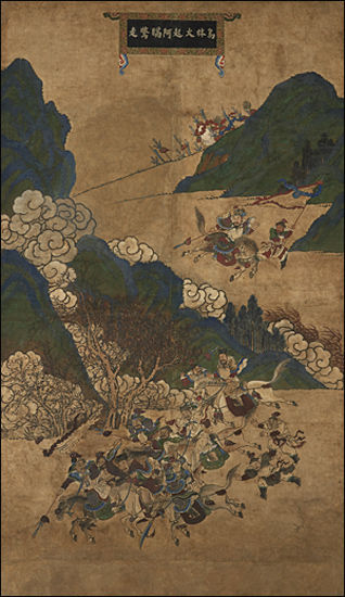 | ▲ 《삼국지도》오림에서 불이 일자 조조가 놀라 도망치다, 230×139cm, 19세기 후기, 서울역사박물관 소장 | ||
