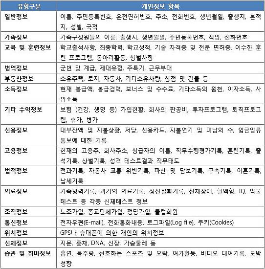 다음의 [표 1]을 보면 개인정보에 대해 좀 더 명확하게 알 수 있다.