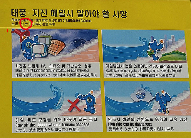 그러나 그 앞에 못미처 <해운대해수욕장지구 지진해일 대피 안내판>이 있는데, 자세히 보니 일본어 부분의 오자가 있어 펜을 들었다.