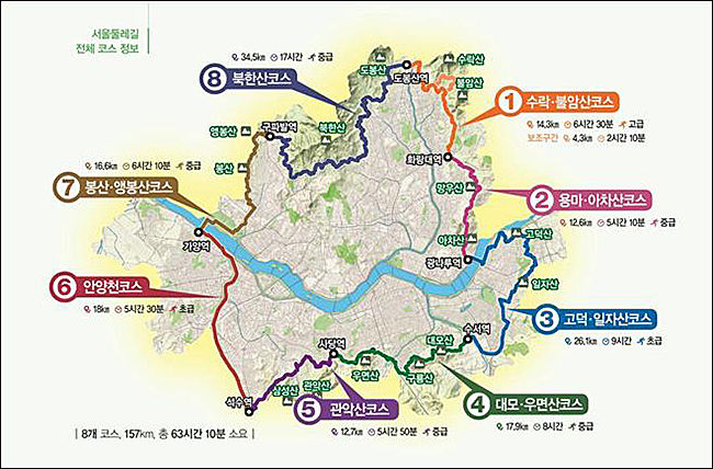 서울둘레길은 서울 외곽을 크게 한 바퀴 도는 157㎞ 트레킹 코스로, 모두 8개 구간으로 구성되어있다. 하루 8시간씩 10일 정도면 완주가 가능하다. 거점별로 마련된 서울둘레길 우체통에서 스탬프 28개를 모두 찍은 완주자에게는 완주 인증서가 발급된다.