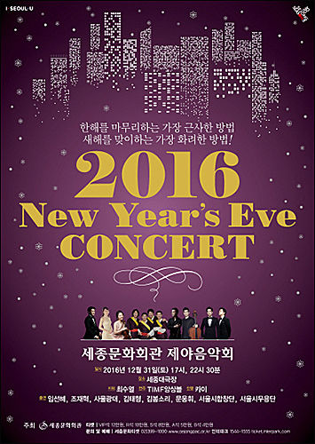 2016년 세종문화회관 제야음악회는 겨울을 녹이는 뜨거운 선율들로 관객들을 찾아간다. 한 해 동안 세종문화회관을 비롯, 전 세계의 무대에서 뛰어난 활약을 보여주었기에 2017년의 무대가 더욱 기대되는 음악인들과 함께할 예정이다.