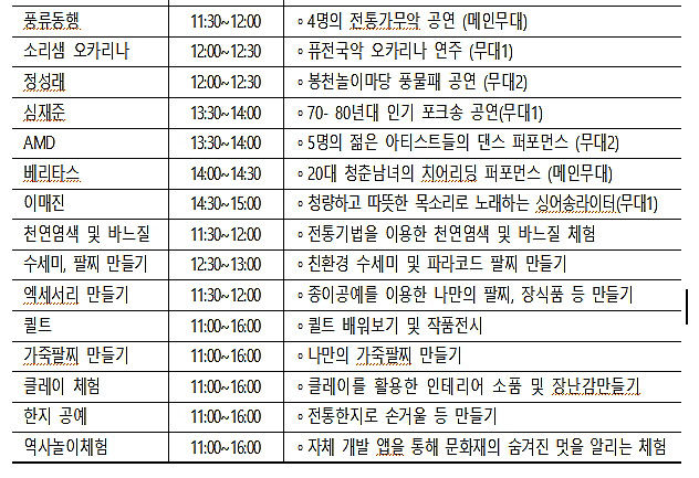 이와 더불어 시민이 직접 만들어 선보이는 치어리딩ㆍ전통가무 등 다양한 공연과 천연염색ㆍ퀼트 등 풍성한 체험활동도 즐길 수 있다.
