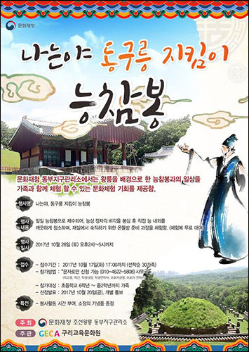 능참봉은 조선 시대 관직으로 품계(종9품)는 낮았지만, 왕릉을 보호하고 제사를 지내며 왕릉 숲의 나무와 건물을 관리하는 등 왕의 무덤을 지킨다는 상징적 의미 때문에 매우 중요한 직책으로 여겨졌다. 이번 행사는 참가자들이 왕릉 관리책임자 ‘능참봉’으로 일일 제수되어 조선 시대 능참봉의 일상과 전통문화를 체험할 수 있도록 기획하였다.