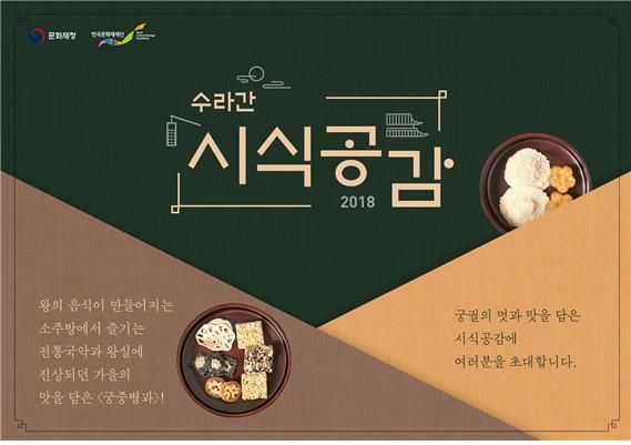 [우리문화신문=한성훈 기자] 문화재청(청장 김종진)이 주최하고, 한국문화재재단(이사장 진옥섭)이 주관하는 2018년 하반기 「수라간 시식공감」이 오는 9월 16일부터 9월 29일까지, 10월 21일부터 11월 3일까지 1일 2회씩 모두 48회 진행된다.