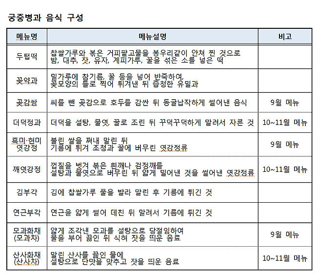 특히, 올해 상반기부터는 왕실에 진상했던 제철 산물을 활용한 궁중음식을 선보이고 있다. 이번 하반기 행사에서는 추수의 계절인 가을을 맞아 햇곡식 등을 이용한 조선 왕실의 ‘궁중병과’를 선보인다. 햇곡식으로 만든 떡과 제철을 맞은 곶감, 더덕, 모과를 사용한 한과, 음료 등을 맛볼 수 있다. 특히, ‘국가무형문화재 제38호 조선왕조궁중음식’ 정길자 보유자가 직접 재현한 궁중병과이기에 그 의미가 더욱 특별하다.