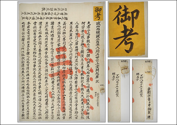 이 시험지는 오른쪽 상단의 ‘어고[御考: 임금이 직접 시험지를 채점함]’ 라는 글이 쓰인 노란 색지가 먼저 눈에 확연히 들어옵니다. 그리고 그 아래는 시험 문제가, 두 번째 줄부터는 응시자의 답안이 기록되어 있습니다. 채점자[순조]는 답안을 읽고 난 뒤, 빨간 색으로 중요한 부분들에 점을 찍고 큰 글씨로 채점하였습니다.