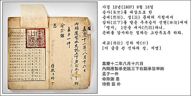 이 두 소장품이 지닌 단서들을 하나하나 찾아보면 당시 상황을 조금 더 상세히 알 수 있습니다. 순조 8년(1807) 8월 15일에는 승사(承史: 승지承旨와 주서注書)들만을 대상으로 《소학》의 한 구절을 주고 설(說)이라는 문체로 글을 짓게 하는 시험이 있었습니다. 《승정원일기》에 보이는 당시 승사는 10명으로, 아주 소수만을 대상으로 시험이 쳤음을 알 수 있습니다.