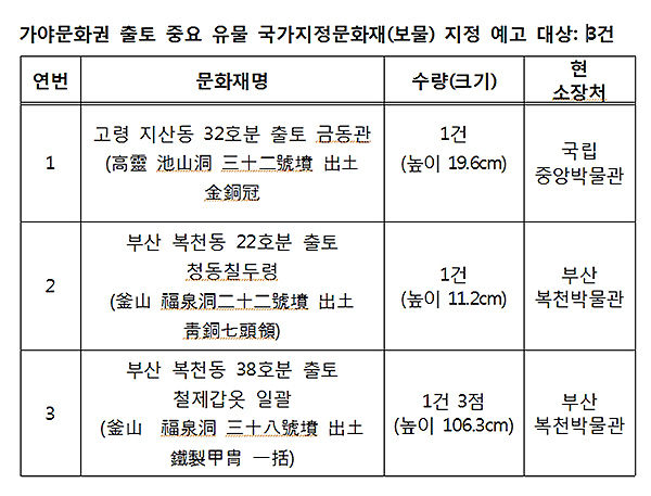 문화재청은 「고령 지산동 32호분 출토 금동관」등 3건에 대해 30일 동안의 예고 기간 동안 각계의 의견을 수렴·검토하고 문화재위원회의 심의를 거쳐 국가지정문화재(보물)로 지정할 계획이다.