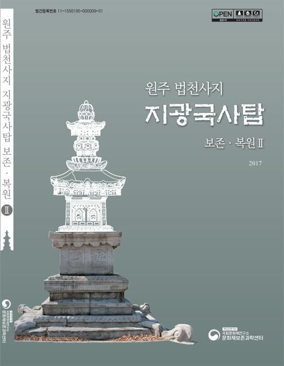 보고서 《원주 법천사지 지광국사탑 보존‧복원Ⅱ》는 2017년 사업내용을 정리한 것으로 보존처리, 조사연구, 학술연구 성과 등을 수록하였다. 1957년 수리에 사용된 시멘트에 의한 손상 원인과 구조적인 문제점을 해석하였고, 시멘트 제거 이후 모습도 확인할 수 있다. 또한, 3차원 입체(이하, 3D)스캔과 3D 프린팅을 활용한 모형제작 등 3D 콘텐츠로 구축한 자료도 담았다.