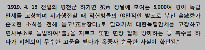 한 예로 남에는 유관순, 북에는 동풍신이라 일컫던 여성독립운동가 동풍신 (1904~1921) 지사의 기록을 보자. (국가보훈처 누리집 → 공훈전자사료관 → 독립유공자공적조서)