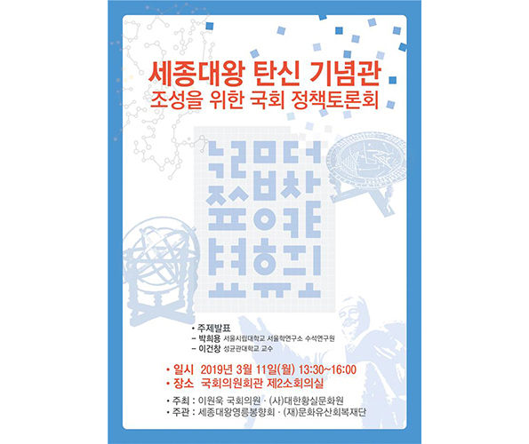 이번 토론회는 ‘세종대왕 탄신 기념관‘ 조성을 위해 각계에서 개별적으로만 진행되어 왔던 그동안의 여러 논의와 향후 활동방안을 구체적이고 실천적으로 망라하여 인간 세종대왕을 후손 대대로 기념할 바람직한 정책 수립으로 결실을 맺고자 한다. 이번 토론회를 통해 세종대왕의 인간적인 면모를 되살리는 뜻깊은 자리가 되기를 기대하고 있다. 이주화 (재)문화유산회복재단 이사는 “<세종대왕 탄신 기념관>을 조성하는 것은 오랫동안 바라던 일이다. 토론회가 단지 토론의 자리로 끝나지 않고, 지연되던 논의를 한층 더 발전시켜 보다 구체적인 방안에 이르게 되기를 기대한다.” 라고 말했다.
