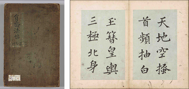 이 서첩은 모두 40쪽으로 앞쪽의 25쪽은 밝은 옥색 비단에 먹으로 썼고, 가운데 9쪽은 매우 옅은 담옥색(淡玉色) 비단에 먹으로 썼으며, 뒤쪽의 6쪽은 검은 비단에 금니(金泥, 금박 가루를 아교풀에 갠 것)로 썼습니다. 옥색ㆍ담옥색ㆍ검은색 비단에 먹과 금니를 써서 작고 큰 글자를 전서ㆍ예서ㆍ해서ㆍ행서ㆍ초서의 오체로 정성스럽게 썼지요.