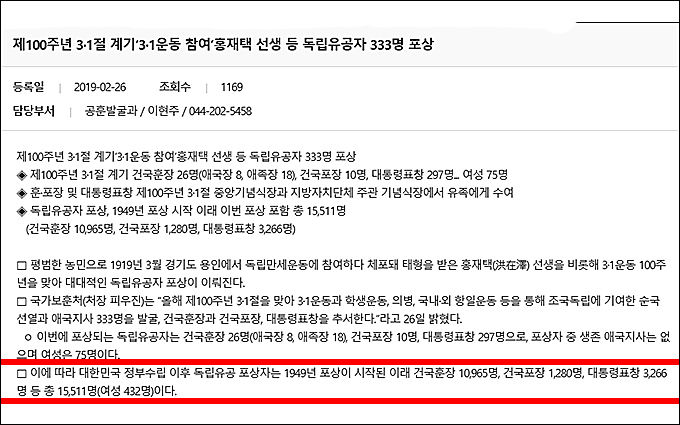 하지만 여전히 정확한 자료제공이라는 면에서는 미흡한 점이 있어 이의 시정이 요구된다. 국가보훈처에서는 2019년 2월 26일치 <보도자료>에서 “대한민국 정부수립 이후 독립유공 포상자는 1949년 포상이 시작된 이래 건국훈장 10,965명, 건국포장 1,280명, 대통령표창 3,266명 등 총 15,511명(여성 432명)이다.”라고 밝혔다.