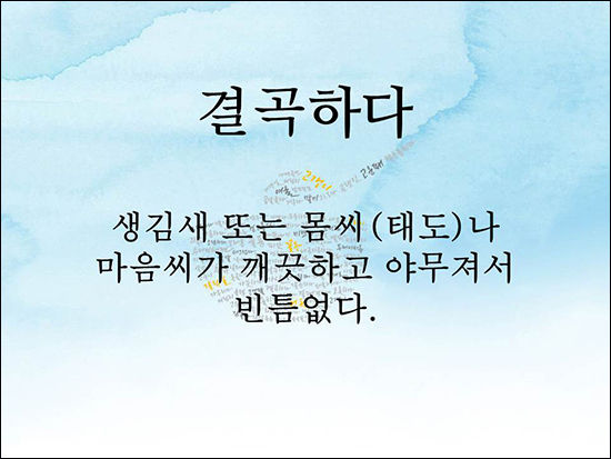오늘 맛보여 드리는 토박이말도 처음 보는 분들이 많을 것입니다. 살다보면 이런 사람을 만날 때가 있습니다. 생김새 또는 몸씨(태도)나 마음씨가 깨끗하고 야무져서 빈틈없는 사람을 봤을 때 쓸 수 있는 말입니다. 이 말을 알고 있으면 쓸 수 있는데 모르면 쓸 수가 없을 것입니다. 저는 '완벽하다'라는 말과 비슷한 말이라고 생각합니다. '완벽한 미모', '완벽한 일처리', '완벽한 자세'와 같은 말을 써야 할 때 떠올려 써 보시기 바랍니다.