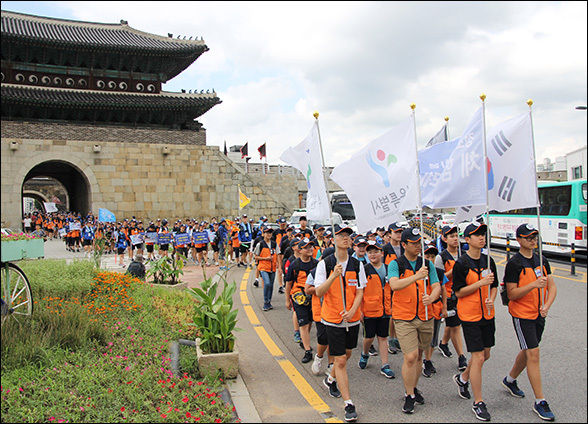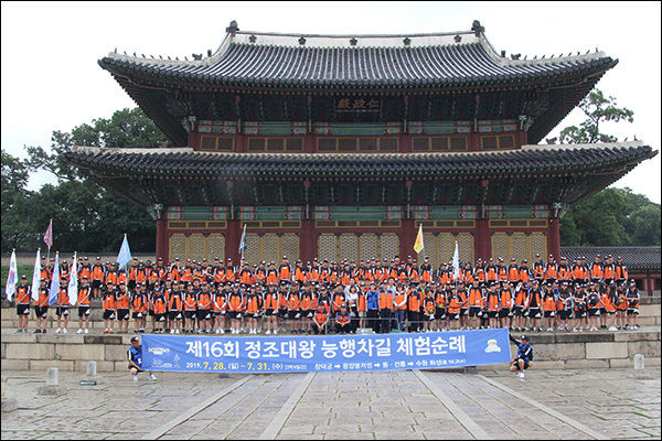 [우리문화신문=이한영 기자] 서울 창덕궁에서 수원화성, 융릉까지 59.2㎞ 구간을 걷는 ‘제16회 정조대왕 능행차길 청소년 체험순례’ 행사가 28일부터 31일까지 3박 4일 동안 열렸다. 이번 체험순례는 정조대왕이 현륭원(사도세자 묘소)을 참배하기 위해 지났던 행차길을 청소년들이 걸으며 정조대왕의 효심과 애민정신을 되새기는 행사다. 수원시와 서울시가 공동 주최했다.