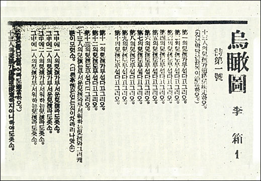 위는 1934년 7월 24일부터 8월 8일까지 조선중앙일보에 연재된 이상(李箱, 본명 김해경)의 시 “오감도(烏瞰圖), 1934”란 시입니다. 1910년 오늘은 그 이상 시인이 태어난 날입니다.(어떤 자료에는 9월 23일로 나오기도 함) 이 오감도란 시는 대체로 이해하기 힘든데 읽다 보면 문득 조금은 두려운 느낌이 들기도 하고, 가끔은 그냥 뜻이 없는 것처럼 느껴지기도 하지요. 그도 그럴 것이 원래는 30회를 목표로 시작한 연재가 "미친놈의 잠꼬대냐?", "그게 무슨 시란 말인가", "당장 집어치워라" 등 비난하는 독자들의 투서가 빗발쳐 연재를 중단하기에 이르게 됩니다.