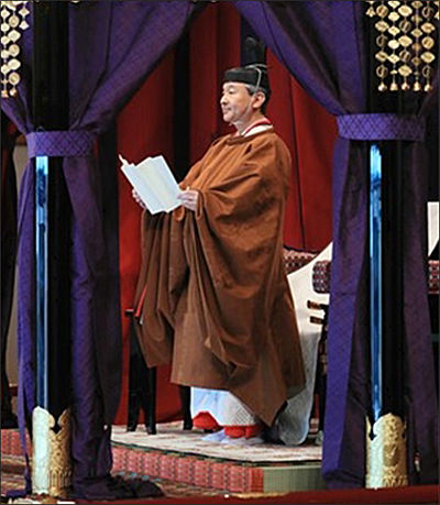 [우리문화신문=이윤옥 기자] 어제(22일) 일본 열도는 일왕 즉위식으로 떠들썩했다. 일왕이 살고 있는 도쿄 황거(皇居)에서 거행된 일왕즉위식은 국내외 2,000여명의 귀빈들이 참석한 가운데 진행되었다. 외국으로부터 찾아온 손님은 191개 나라에서 423명이 참석했다고 한다. 이날 일왕즉위식은 낮 1시 5분, 위엄있는 전통복으로 갈아입은 일왕이 ‘국민의 행복과 세계평화를 빌며 국민에 가까이 다가서겠다.’는 내용의 선언을 시작으로 약 30여 분 동안 즉위식이 이어졌다.