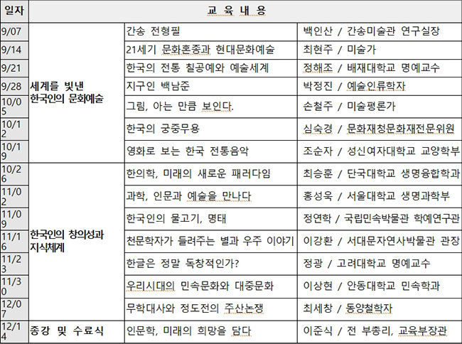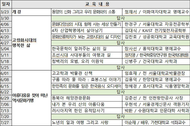 2020년도 강의는 ▲고령화시대의 행복한 삶, ▲아름다움을 찾아 떠난 역사문화기행, ▲세계를 빛낸 한국인의 문화예술, ▲한국인의 창의성과 지식체계 등 4개의 테마를 중심으로 이론 강의(29회), 문화답사(5회)로 이루어져 있다.