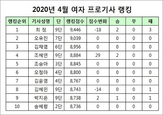 여자기사 중에서는 최정 9단이 네 계단 내려앉으며 22위에 자리했으며, 오유진 7단은 지난달과 같은 98위를 차지했다.