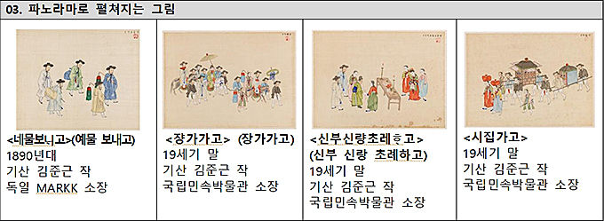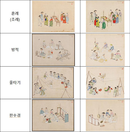 그림 가운데 ‘그네뛰기’, ‘베 짜기’처럼 주제가 유사하지만, 서로 다른 인물과 구도의 풍속화도 있어서 눈길을 끈다. 또한, 예물 보내는 모습부터 친영 행렬, 초례, 신부 행렬에 이르기까지 혼례 과정을 보여주는, 마치 파노라마 같은 그림도 전시된다.