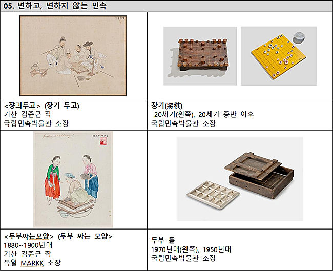 ‘수공업(갈이장이, 대장장이)’, ‘식생활(맷돌, 두부, 물긷기), ’놀이(바둑, 장기, 쌍륙), ‘연희(삼현육각, 탈놀이), ’일생 의례(혼례)‘, ’의생활(모자, 다듬이질), ‘사회생활(시험, 합격)’의 7개 주제를 중심으로 기산 풍속화, 사진엽서, 민속자료, 영상을 통해 쇠퇴하거나 변화하고 지속하는 민속의 특성을 소개한다.