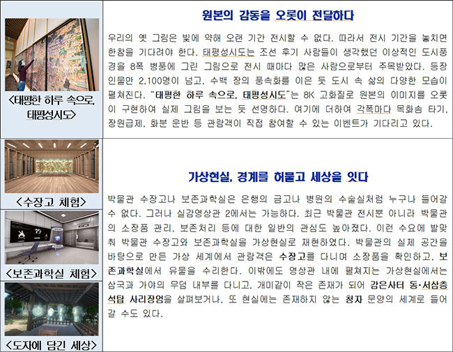 ‘디지털실감영상관 2(2층 기증관 휴게실)’에서는 폭 8.5미터 크기의 8K 고해상도로 구현된 조선 후기의 태평성시도(작자미상) 작품 속에서 등장인물 2,100여 명이 각기 다르게 움직이며 관람객의 행동에 반응하는 모습을 감상할 수 있다. 그런가 하면 평소에 전시실에서 볼 수 없어 더 궁금한 박물관 수장고와 소장품을 보존 처리하는 보존과학실도 가상현실(VR) 기술을 통해 만나볼 수 있다. 수장고를 거닐며 전시되지 않은 보물들을 볼 수 있고 유물을 직접 수리해 보는 등 몰입감 있는 체험을 할 수 있다.