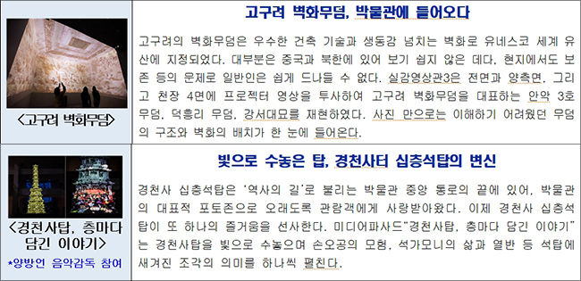 관람객들은 중앙박물관 네 개의 상설전시공간에서 실감콘텐츠를 만나볼 수 있다. ‘디지털실감영상관 1관(1층 중근세관 내)’과 ‘디지털실감영상관 3관(1층 고구려실내)’은 프로젝션맵핑* 기술로 공간을 채웠다. 영상관 1관에서는 보물 제1875호인 정선의 ‘신묘년풍악도첩’ 등을 소재로 한 4종류의 고화질 첨단영상을 폭 60미터, 높이 5미터의 3면 파노라마를 통해 감상할 수 있다. 영상관 3관에서는 북한에 있는 안악3호무덤 등 고구려 벽화무덤을 사실적으로 재현해, 무덤 속에 실제로 들어간 것과 같은 체험을 할 수 있다.